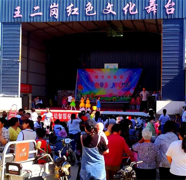 王二崗書香門第幼兒院,更是熱鬧非凡,六月一日下午四點,幼兒園的師生五十余人排著整齊的隊伍,穿越早早就聚積在文化廣場的數(shù)百位觀看兒童表演節(jié)目的村民人群,走上紅色文化大舞臺。