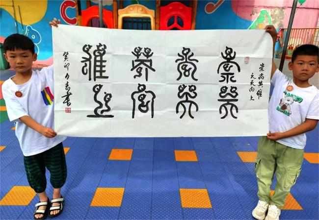 馬投澗鎮(zhèn)王二崗紅色文化合作社分別為他們送上書法作品"勇毅前行,碩果飄香。″鳥蟲篆,"崇尚英雄,天天向上。″龍安區(qū)文廣體旅游局龍圖街甲骨文書屋送上了設制的文化胸卡"學無止境″、"志存高遠″。用文字祝賀和鼓勵兒童好好學習,健康成長。