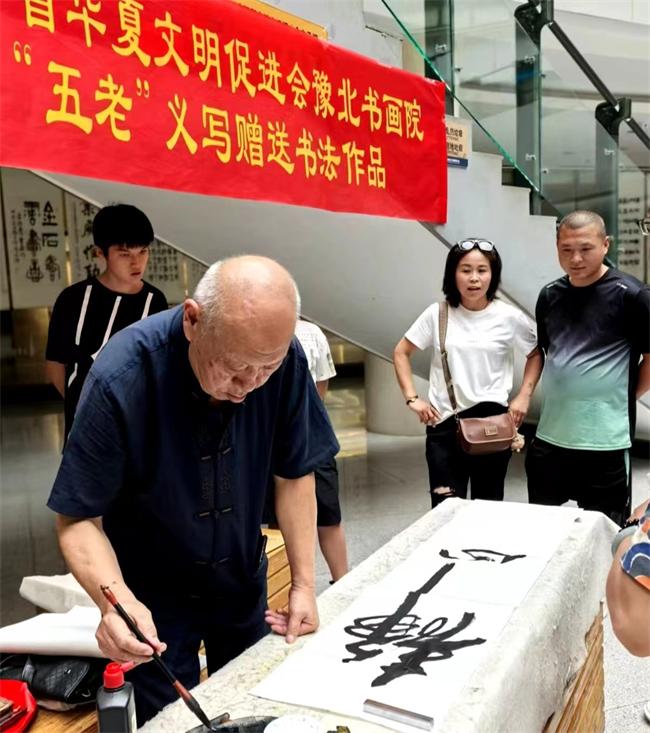 他們每天自帶筆墨、氈布、紙張,從九點一直書寫到11點,一幅幅親手書寫的書法作品贈送到群眾手中,感動著人們,每個同志汗水在臉上流淌,忘記了疲勞,受到廣大民眾的贊揚,充分體現了五老書畫家健康向上,老有所樂、老有所為余熱生輝的奉獻精神。