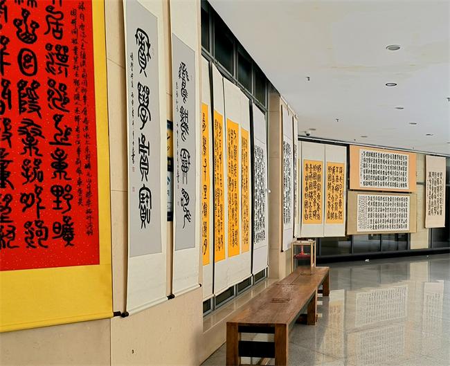 本次展出作品120件,有四尺、六尺、八尺作品毛澤東詩詞,唐詩宋詞,有少年中國說等。其中有鳥蟲篆三十米長卷毛澤東詩詞,有行書臨寫唐伯虎《落花詩冊》50米長卷,有臨寫趙孟頫行書20米長卷,有臨寫王羲之行書15米長卷。