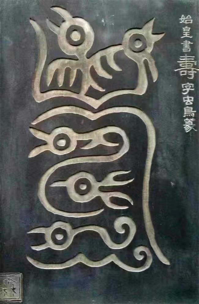 趙力志同志在深入學(xué)習和研究古代鳥蟲篆理論的同時,他又投入大量時間去了解古代鳥蟲篆的文獻、實物和歷史背景,他曾到湖南衡山考察《禹王碑》,到成都青羊?qū)m考察始皇書《壽》字,從中理解鳥蟲篆的文化內(nèi)涵和藝術(shù)特色。通過臨摹古代鳥蟲篆經(jīng)典作品,如李斯書寫的秦傳國玉璽上《受命于天既壽永昌》,千字文中《治夲於農(nóng)務(wù)茲稼檣》等文字,他掌握了秦代鳥蟲篆的基本技法和風格特點,為他在鳥蟲篆的創(chuàng)新打下了堅實的基礎(chǔ)。