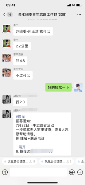 社工:喂,您好金水區(qū)團委?志愿者:你們還需要志愿者嗎?我要報名志愿者。社工:好的,您別急。您加公眾號上的微信號,加入微信群,積極關(guān)注群里志愿者招募消息,根據(jù)自己地點時間交通情況就近參加志愿者服務(wù)。社工兩小時內(nèi)接到這樣的電話百余通,上百通的電話打來,都是加入志愿者團隊想為汛情后重建貢獻力量的青年人。社工協(xié)助金水區(qū)團委建立5個防汛志愿者群,協(xié)助組織招募轄區(qū)各街道的志愿服務(wù)。