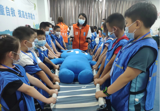 本次活動中,志愿者采用體驗式學(xué)習(xí)的方法,在教會小記者們千斤頂抬升、AED的使用、家具防傾倒、海姆立克急救法、毛毯擔(dān)架計時賽、結(jié)繩大比拼等6項技能后,由他們親身體驗各項安全救護知識,在體驗中快速掌握這些救護能力。