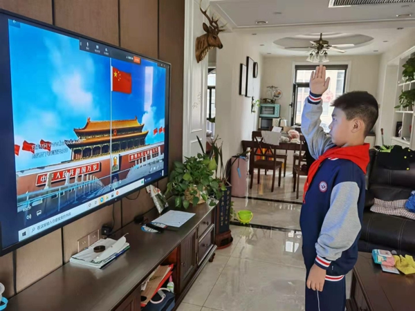少先隊員在中隊輔導員的積極組織下,準時進入了班級線上升旗直播。當視頻中雄壯的國歌奏響、鮮艷的五星紅旗冉冉升起時,少先隊員神情嚴肅,挺胸抬頭目視國旗,情不自禁唱起了國歌,心中充滿了無限的憧憬和展望。隨后,大家共同觀看了少先隊員為老師精心錄制的慶祝教師節(jié)視頻:《老師,您辛苦了》。少先隊員用情真意切的話語,表達了對老師的深深感恩之情,使老師感受到了節(jié)日的溫馨。少先隊員代表劉安澤無不感慨地說:“加減乘除,算不盡老師的無私奉獻;詩詞歌賦,頌不完對老師的滿懷崇敬,感謝老師,給了我們放眼世界的慧眼,感謝老師,幫我們指明人生的方向。”