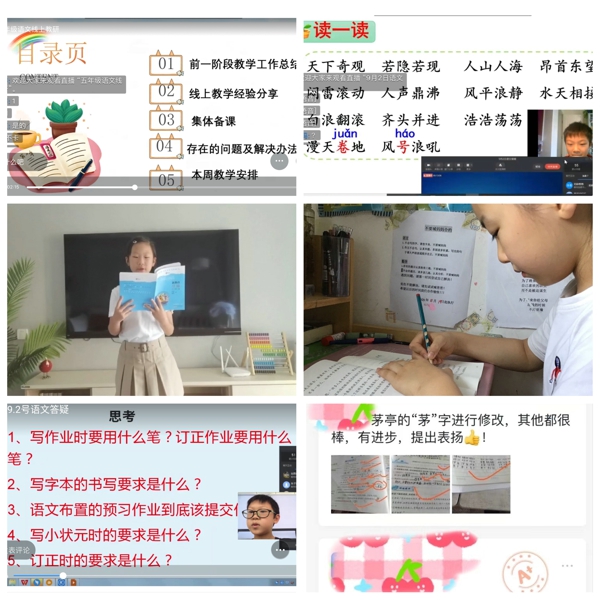 語文組共享教學(xué)資源,認(rèn)真研讀教材、集體在線研討、精心制作課件。晨曦誦讀,與黎明共舞,領(lǐng)略母語的魅力,積累優(yōu)美語言文字;陽光午讀,師生共讀經(jīng)典,豐富精神內(nèi)涵;線上課程、答疑互動(dòng),打造高效出彩課堂,讓孩子們樂學(xué)善思,學(xué)有所獲,出彩成長每一天。