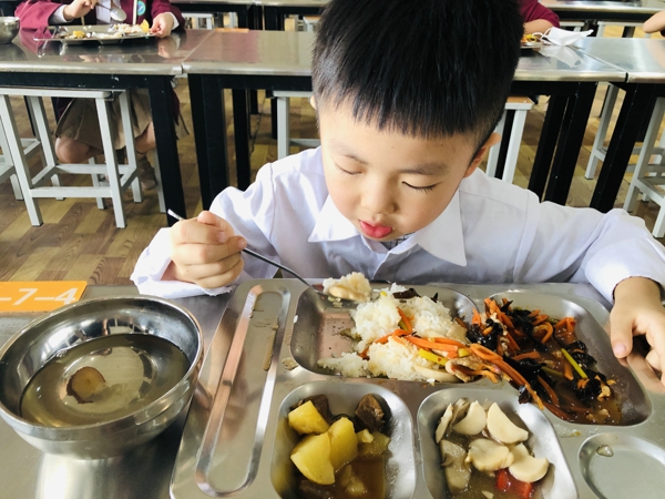 中午,豐盛的午餐已經(jīng)早早準(zhǔn)備好,同學(xué)們?cè)诶蠋焸兊膸ьI(lǐng)下間隔而坐,品味美食,心懷感恩。