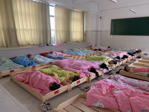 中午的團(tuán)結(jié)路校區(qū)整個(gè)校園都是靜悄悄的,在一個(gè)小時(shí)的午睡時(shí)間里,學(xué)生再也不用趴著睡,都可以躺著睡了。吃過午飯后,學(xué)生們有序排隊(duì)到達(dá)制定就寢教室,在老師的引導(dǎo)下,找到自己的小床,迅速鋪好被褥,頭對頭,腳對腳,舒舒服服地進(jìn)行午休。