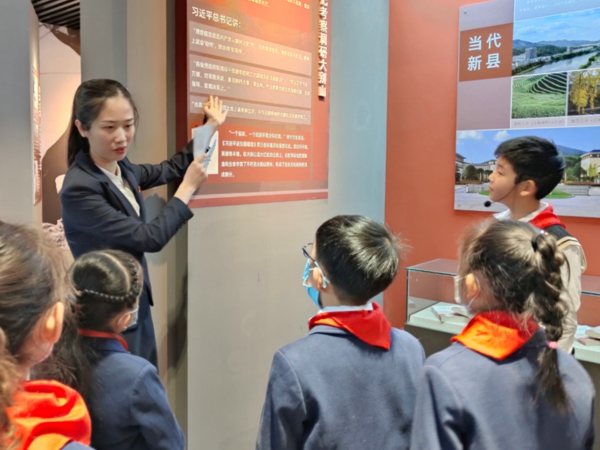 紅領(lǐng)巾講解員們認(rèn)真聽團(tuán)員姐姐講故事