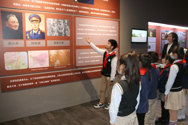 首先,河南省圖書館團(tuán)員志愿者講解員“小鹿姐姐”為隊(duì)員們講述展廳中的故事,隊(duì)員們跟隨著“小鹿姐姐”在展區(qū)里打卡河南省的“紅色地標(biāo)”,了解在河南這片16.7萬平方千米的中原沃土上,形成的眾多紅色精神與紅色文化。透過一塊塊展板,一張張照片,一個(gè)個(gè)物件,少先隊(duì)員們真切地感受著河南人民奮斗的歷史與取得的成就。“小鹿姐姐”親切的笑容、自信的儀態(tài)、清晰的講解吸引著這群特別的小觀眾,引來隊(duì)員的陣陣掌聲。一個(gè)個(gè)紅領(lǐng)巾講解員也不甘示弱,邊聽邊模仿,虛心請(qǐng)教。
