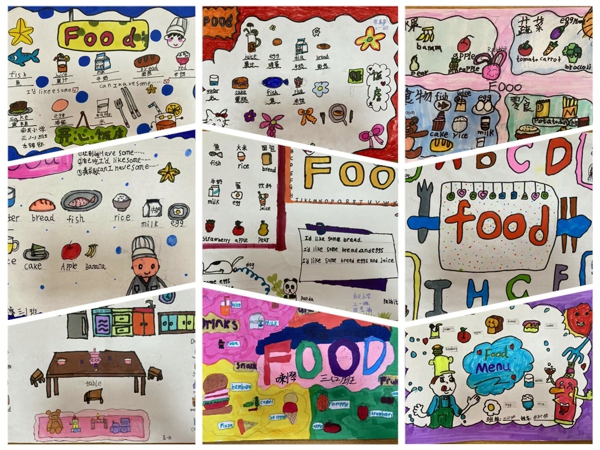 三年級同學(xué)們繪制以“food”為主題的手抄報(bào),向大家展示了他們精心制作的美食菜單。他們精心設(shè)計(jì),開動(dòng)腦筋,不僅鞏固了本單元的基礎(chǔ)知識,還拓寬了英語文化視野。