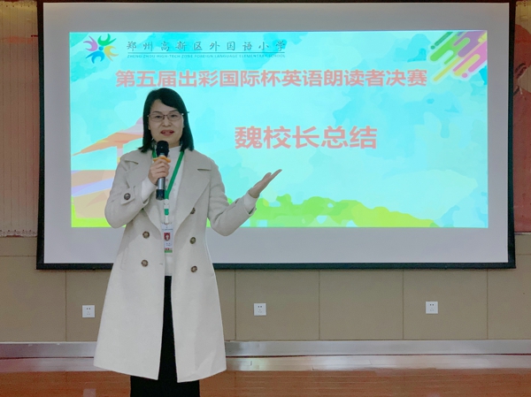 最后,外國語小學(xué)教學(xué)副校長魏艷進(jìn)行精彩的點(diǎn)評(píng)和總結(jié)。魏校長夸贊道,今天站在決賽舞臺(tái)上的每一位學(xué)生都是最閃亮的星,并對(duì)本次活動(dòng)給予了高度的贊揚(yáng),也對(duì)“雙減”政策下的英語教學(xué)工作提出了寶貴的意見。她表示,愿外小所有的出彩果兒都能在活動(dòng)中不斷體驗(yàn),在鍛煉中學(xué)好英語,與更多的智者對(duì)話,了解世界各地不同的文化,增長自己的見識(shí)。