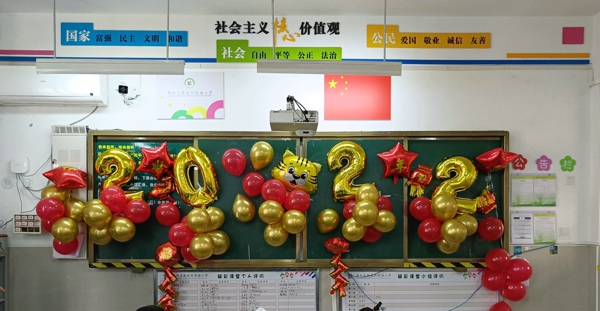 值此佳節(jié),各中隊(duì)教室也裝飾一新,黑板上的彩色裝飾畫與五顏六色的氣球交織在一起,濃濃的節(jié)日氣氛溢滿校園。