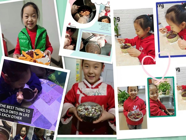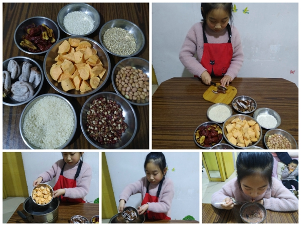 因疫情原因,隊員們在學校的倡議下紛紛居家開展了主題實踐教育活動。他們在父母的帶領下一起搜集臘八節(jié)資料,了解臘八節(jié)的起源、習俗,同時在父母的幫助下一起購買臘八粥的原材料,了解制作臘八粥流程,和父母一起做臘八粥,體驗傳統(tǒng)節(jié)日的美好。