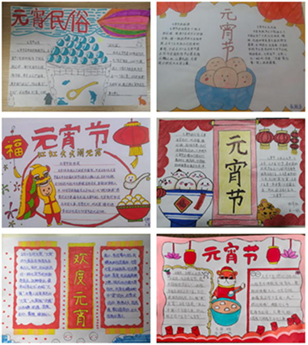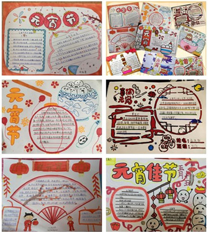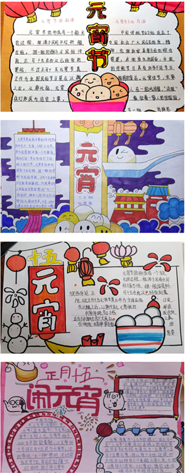 五、六年級的同學(xué)們通過電視、網(wǎng)絡(luò)、和家人交談、到社區(qū)實(shí)地調(diào)查等多種形式了解元宵節(jié)的來歷和風(fēng)俗習(xí)慣。用一張張圖文并茂、內(nèi)容豐富的手抄報(bào),畫出了喜慶與團(tuán)圓。一幅幅色彩絢爛、生動(dòng)有趣的圖畫,營造了元宵佳節(jié)的熱鬧氛圍,展現(xiàn)了現(xiàn)在穩(wěn)定、祥和的幸福生活。