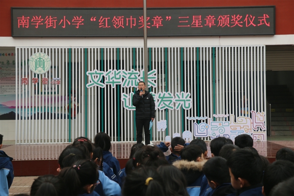 在頒獎(jiǎng)儀式現(xiàn)場(chǎng),該校大隊(duì)輔導(dǎo)員王曉杰宣讀了獲得三星章隊(duì)員名單,黨支部書(shū)記魏志英給獲獎(jiǎng)隊(duì)員戴上了象征榮譽(yù)的獎(jiǎng)?wù),同時(shí)勉勵(lì)隊(duì)員們要再接再厲,不斷爭(zhēng)取新的進(jìn)步,起好模范帶頭作用,繼續(xù)展現(xiàn)少先隊(duì)員的風(fēng)采。獲獎(jiǎng)代表也紛紛表示:希望大家要積極傳承革命先輩的優(yōu)良傳統(tǒng),在學(xué)習(xí)中增長(zhǎng)知識(shí),在實(shí)踐中盡展風(fēng)采,在少先隊(duì)組織中獲得進(jìn)步和成長(zhǎng),努力成為自信、自強(qiáng)、有能力、有擔(dān)當(dāng)?shù)男聲r(shí)代好少年。