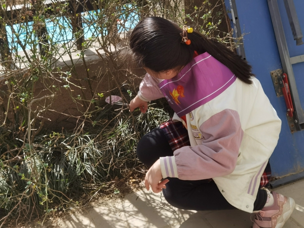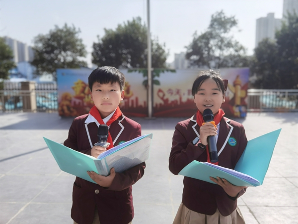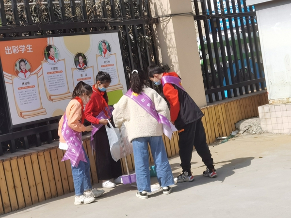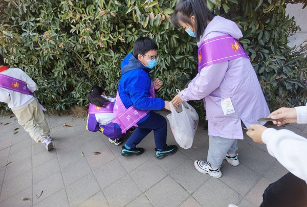 少先隊員們走出教室,撿起每片紙屑、垃圾,用自己的實際行動美化校園。