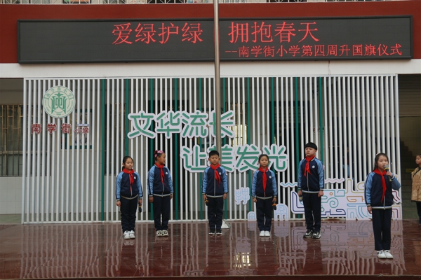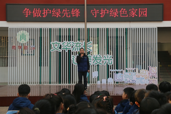 在主題升旗儀式上,該校大隊(duì)輔導(dǎo)員王曉杰倡議大家積極行動,用實(shí)際行動,踐行愛綠護(hù)綠的決心。