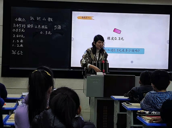 三年級的牛小俊老師為我們帶來了精彩紛呈的——《小數(shù)的初步認識》。本節(jié)內(nèi)容的安排符合學生的認知特點,通過文具店的標簽、每天的體溫測量等引入小數(shù),激發(fā)學生的學習興趣又很自然的與之前內(nèi)容聯(lián)系起來。在探究新知的過程中使用兩個活動寓教于樂,體會小數(shù)的含義。在課堂結(jié)束前還展示了小數(shù)的歷史以及抗疫中的小數(shù),培養(yǎng)學生愛國之情的同時還體現(xiàn)了知識來源于生活,生活中處處存在數(shù)學。