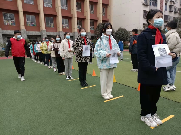21日上午8:50,大隊輔導員李翠老師統(tǒng)一調(diào)配,王瑩瑩、陸政兩位老師用心組織提醒,學生們自覺對照地面標識,保持好一米間隔,全程佩戴好口罩,進行核酸檢測,檢測完畢后學生有序回班。
