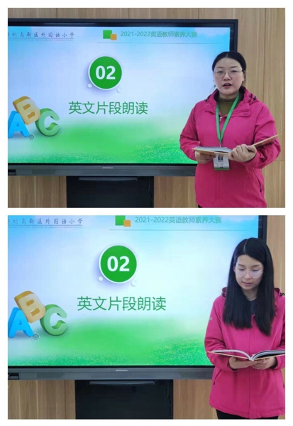 英語(yǔ)教師的口語(yǔ)朗讀是必備素養(yǎng),潛移默化中對(duì)學(xué)生的長(zhǎng)足發(fā)展起著重要作用。依然是采用抽簽的形式,教師隨機(jī)上臺(tái)進(jìn)行課文朗讀,發(fā)音規(guī)則、朗讀技巧、臺(tái)風(fēng)面貌均全面體現(xiàn),學(xué)科組骨干教師進(jìn)行現(xiàn)場(chǎng)評(píng)價(jià)。
