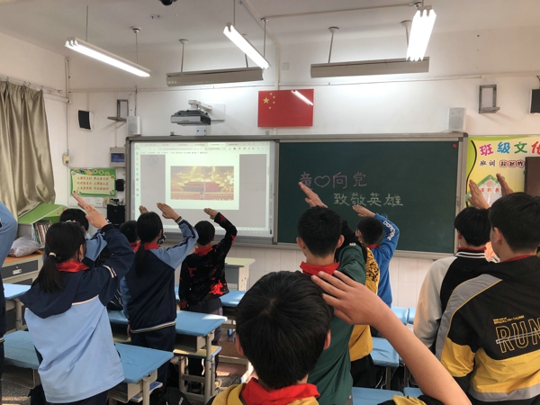 隊(duì)會(huì)課上,各中隊(duì)輔導(dǎo)員向隊(duì)員們介紹了清明節(jié)的由來和習(xí)俗,同時(shí)講述了董存瑞、邱少云、劉伯承、狼牙山五壯士等英雄的愛國主義事跡。“今天的幸福生活是無數(shù)革命先烈拋頭顱、灑熱血用生命換來的,我們應(yīng)該努力學(xué)習(xí),為將來建設(shè)祖國做貢獻(xiàn)。”五(3)班商子墨激動(dòng)地說道。二(1)中隊(duì)輔導(dǎo)員劉廣勇向隊(duì)員們講道:“愛國是奉獻(xiàn)的實(shí)質(zhì)和核心。雖然我們身處和平年代,無法體會(huì)戰(zhàn)爭(zhēng)的困苦與磨難,但我們?nèi)圆荒芡洑v史,在中華民族面臨危難的時(shí)候,是先烈們挺身而出,把滿腔的熱血灑遍祖國的大地,我們要向他們致敬。”