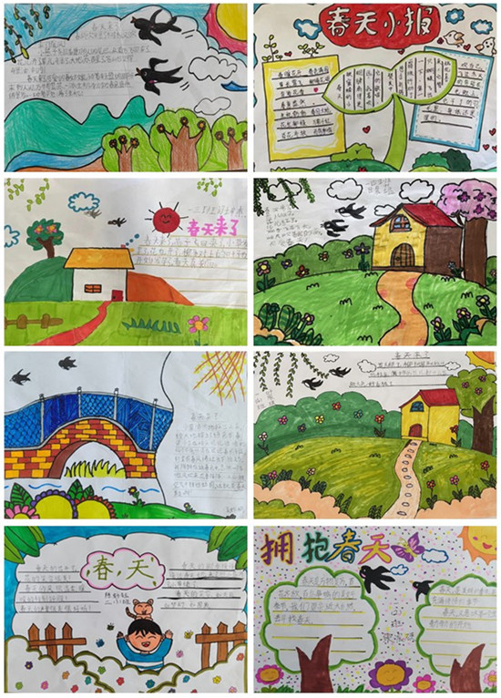 孩子們來到戶外,他們用眼睛作相機(jī),用畫筆記錄下春的印記,他們用心靈用文字歌頌春天、贊美春天。孩子們的作品上,長(zhǎng)長(zhǎng)的柳條,在春風(fēng)中蕩起了秋千;嬌艷欲滴的海棠花,散發(fā)著迷人的清香;五彩繽紛的郁金香隨風(fēng)搖曳,讓人沉醉。孩子們將他們收入眼底,作為自己收集春天的素材,用稚嫩的畫筆精心描繪。孩子們?cè)谝环膱D畫中,你一言我一語地訴說著自己對(duì)春的熱愛,有的還活學(xué)活用一年級(jí)下冊(cè)語文園地中的四字詞語搭配。欣賞他們的作品仿佛是一種享受,讓我們看到雙減下一群快樂的最美少年。
