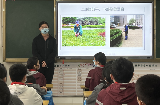 午餐后的課程可謂豐富多彩。“石榴果”們在老師的帶領(lǐng)下對校園的綠植進(jìn)行松土、修剪。他們采用回縮修剪法使植物枝干粗壯,用實(shí)際行動悉心養(yǎng)護(hù)花草樹木。