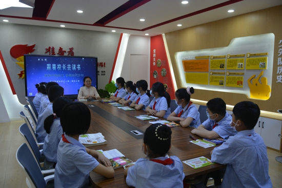尋覓著遠處的讀書聲,走進一樓少年隊活動室。瞧,“跟著校長去讀書”閱讀欄目正在如火如荼的進行著。學校黨支部書記、校長孫冬梅正帶領少先隊員們暢游書海,探索科學的秘密。她還結合當下時事,以神舟十三號飛船返回地球為出發(fā)點,引導孩子們暢談中國航天的發(fā)展歷程,幼小的心靈已悄然種下探索科學的種子,愛國主義情懷也在閱讀探索中不斷生發(fā)。交流分享會、撰寫讀書卡、自編自創(chuàng)閱讀三句半、贏得閱讀幣……孩子們享受著閱讀帶來的快樂。欄目開設以來,跟著校長去讀書已成為校園新風尚,博學多才的校長媽媽成為了孩子們追尋的“星”。