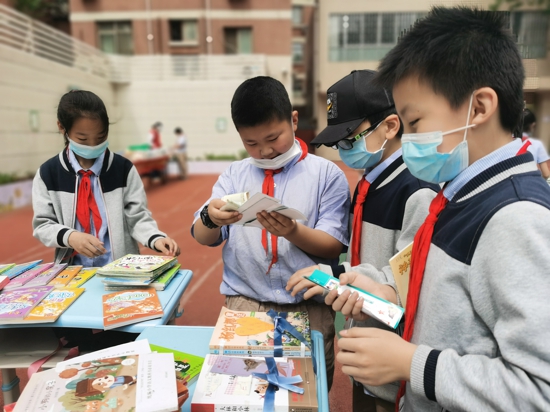 最引人矚目的要數(shù)孩子們手里拿的“校園閱讀幣”,10元、5元、2元、1元四種面值,這可是孩子們通過日常閱讀積分換取的,等同于人民幣在購書狂歡節(jié)上使用。不同面值的閱讀幣流通在各個圖書攤位上,加減乘除大家用,賠本買賣不可取,討價還價是常事,購得圖書有秘籍。同學們臉上洋溢著幸福的笑容,各個沉浸在購書狂歡節(jié)所帶來的妙趣中。沒有在校內購得心儀書籍的,還可以在4月23日持校園閱讀幣到指定書店購買新書。