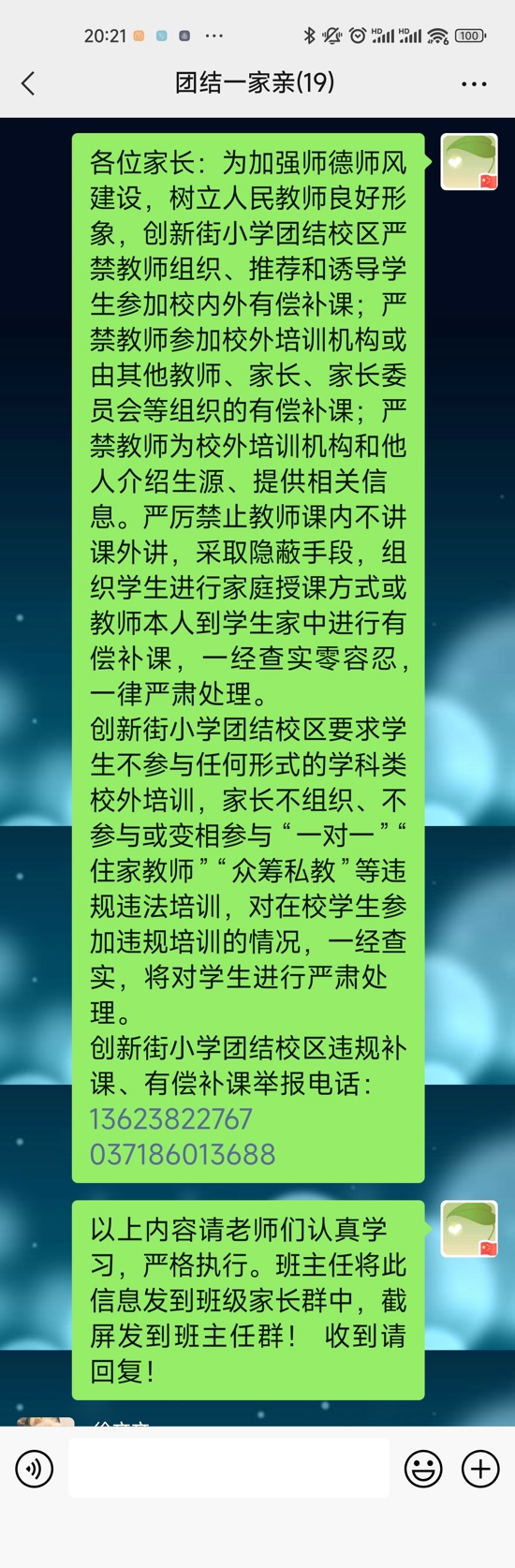 支部書記李莉娟向老師們提出了明令禁止,提出了師德師風(fēng)的相關(guān)要求,嚴禁教師組織、推薦和誘導(dǎo)學(xué)生參加校內(nèi)外有償補課;嚴禁教師參加校外培訓(xùn)機構(gòu)或由其他教師、家長、家長委員會等組織的有償補課;嚴禁教師為校外培訓(xùn)機構(gòu)和他人介紹生源、提供相關(guān)信息。禁止教師課內(nèi)不講課外講,采取隱蔽手段,組織學(xué)生進行家庭授課方式或教師本人到學(xué)生家中進行有償補課,一經(jīng)查實零容忍,一律嚴肅處理。隨后,各班班主任將內(nèi)容和舉報電話轉(zhuǎn)發(fā)至家長群當(dāng)中,歡迎家長的監(jiān)督。