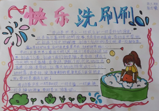 同學(xué)們?cè)诰W(wǎng)課學(xué)習(xí)之余,還當(dāng)起了“家務(wù)小能手”,做自己力所能及的家務(wù)勞動(dòng),各盡所能,各盡所職干好自己的活兒。經(jīng)過(guò)學(xué)校的前期安排部署,三四年級(jí)同學(xué)們以“快樂(lè)洗刷刷”為主題,感受勞動(dòng)的快樂(lè)。瞧,同學(xué)們認(rèn)真洗衣服的模樣可真美!在刷子的揮舞下,書(shū)包和鞋子也煥然一新,變了模樣?粗约旱膭趧(dòng)成果,孩子們臉上綻放出滿(mǎn)意的笑容。除此之外,同學(xué)們還將自己的勞動(dòng)體會(huì)以手抄報(bào)形式呈現(xiàn)出來(lái),精彩連連。通過(guò)快樂(lè)洗刷刷主題活動(dòng),同學(xué)們不但體會(huì)到了勞動(dòng)的樂(lè)趣,而且還感受到了父母的辛勞。
