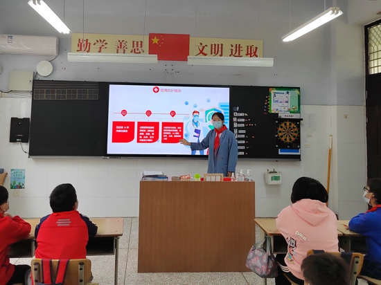 復(fù)學(xué)第一課,各班級(jí)召開(kāi)防疫主題隊(duì)會(huì),讓學(xué)生們?cè)俅稳媪私庖咔橄嚓P(guān)知識(shí)和防護(hù)措施,做好心理健康教育。