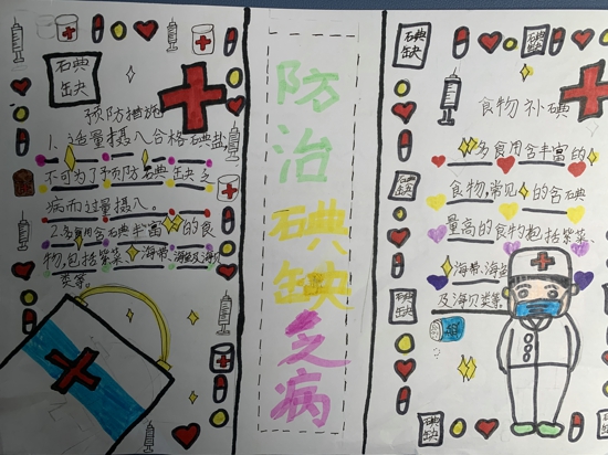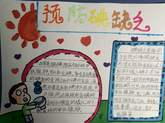 課下,學(xué)生們通過制作科普手抄報(bào),做起家庭健康宣傳員,向家中的弟弟妹妹、爸爸媽媽宣講防治碘缺乏病的相關(guān)知識(shí),倡導(dǎo)大家科學(xué)飲食,健康飲食。