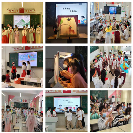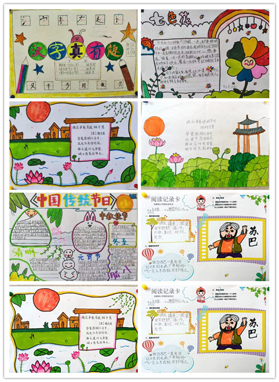校園劇《動(dòng)物王國開大會(huì)》、《要下雨了》、《十二個(gè)月》,學(xué)生們用童真的演繹把課文搬上舞臺(tái),將自己化身為最愛的人物形象“粉墨登場(chǎng)”;手勢(shì)舞《池上》、《小池》,學(xué)生們身穿漢服,熱情洋溢,朗朗上口的詩句時(shí)而輕快響亮,時(shí)而錯(cuò)落婉轉(zhuǎn);“長大是什么?”,小小朗讀者用細(xì)膩真摯的感情,清新甜美的嗓音朗誦詩歌《我長大了》,每個(gè)小聽眾備受鼓舞,真情歡呼;童謠《老鼠和貓》、《顛倒歌》,學(xué)生們用和諧的韻律、明朗的節(jié)奏,讓童趣與笑臉相映,童謠與笑聲齊飛……室內(nèi)活動(dòng)現(xiàn)場(chǎng)掌聲不斷、熱鬧非凡,室外展板上一幅幅精心繪制的讀書小報(bào)、閱讀記錄卡潤澤心田。學(xué)生們徜徉書海,書香盈滿校園。