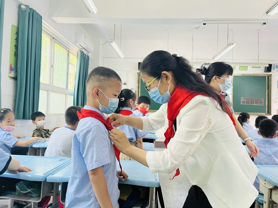 孫校長(zhǎng)為新隊(duì)員佩戴紅領(lǐng)巾