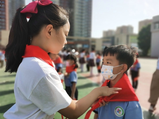 優(yōu)秀隊員代表為他們佩戴紅領(lǐng)巾。