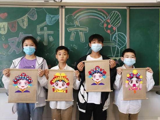 六年級的龍寶收到的是“國粹京劇臉譜”禮物,同學(xué)們以小組為單位進行團隊創(chuàng)作。用團隊共同的合作來紀念在五龍口的最后一個兒童節(jié)。