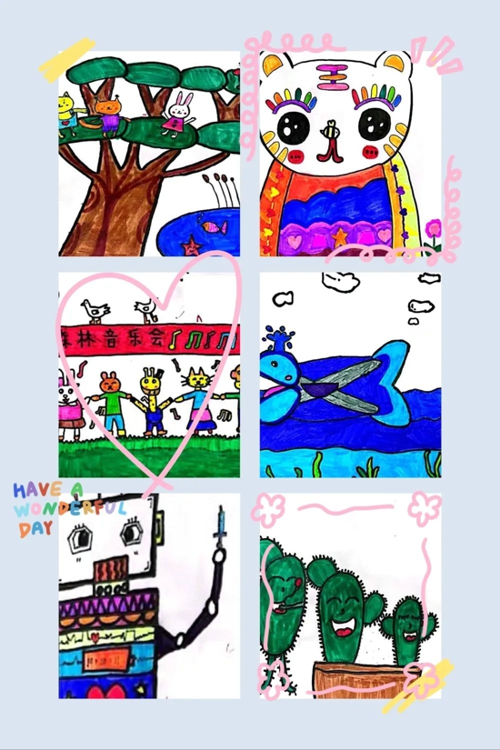 美術(shù)學(xué)科的評(píng)價(jià)主題為《動(dòng)物唱歌的模樣》和《有趣的動(dòng)漫形象》。小嫩芽們根據(jù)題目及繪畫要求,自由大膽地進(jìn)行創(chuàng)作,他們的作品構(gòu)思新穎,想象豐富,色彩飽滿,線條流暢,畫面妙趣橫生。接下來一起來看看小嫩芽們的創(chuàng)作吧!