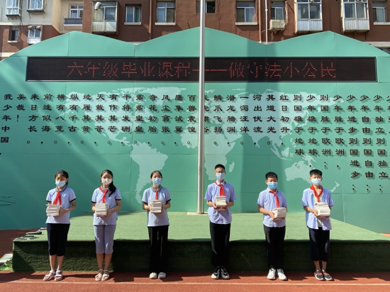 在六年級同學即將畢業(yè)之際,河南省司法廳普法與依法治理處為畢業(yè)班同學們送來了“法寶”——《法治護航成長》校園安全知識手冊,讓孩子們知法學法零距離。在贈送儀式上,鄭州市金水區(qū)工人第一新村小學黨支部書記、校長孫冬梅親自為每一位畢業(yè)生贈送一本手冊,作為六年級畢業(yè)課程成長系列學習內容,引領同學們樹立正確的道德觀、法制觀,筑牢思想之基、行動之基。