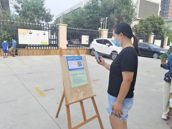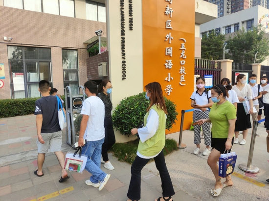 8點整,在引導(dǎo)老師的指引下,家長們出示健康碼、行程碼,并測溫,有序進入校園等候區(qū)。“為了減少人員聚集,我們把片區(qū)內(nèi)的家長分成組,在學(xué)校的室內(nèi)場館為家長發(fā)放報名編號,按編號入場,并且只能由一位監(jiān)護人進入校園報名登記。”五龍口校區(qū)教務(wù)副主任楊瑞娟介紹。