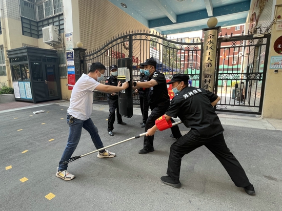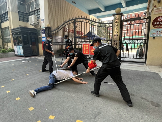 演練開始,一名由老師扮演的“歹徒”欲闖入學(xué)校內(nèi),被保安詢問阻攔后,“歹徒”手持利刃想強行闖入,門衛(wèi)室保安見狀迅速做出反應(yīng),第一時間摁下報警設(shè)備提醒校園內(nèi)老師組織學(xué)生撤離,同時拿起防暴盾牌、鋼叉上前阻止,與“歹徒”周旋。
