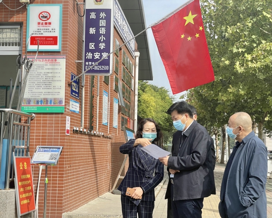 中新河南網(wǎng)10月10日電(吳勇強)為確保國慶假期后學生安全有序返校,進一步推進學校校園管理和日常疫情防控工作,10月8日,鄭州市教育局黨組書記、局長楚惠東在高新區(qū)管委會社會事業(yè)局副局長李國林的陪同下,蒞臨高新區(qū)外國語小學,就學校疫情防控和校園安全等各項工作進行全方位指導。