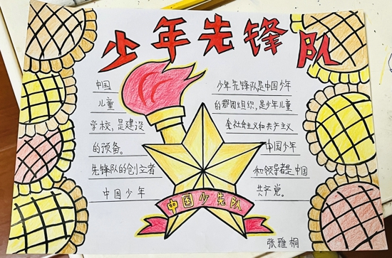 “我知道了隊(duì)旗的圖案的意義:五角星代表黨的領(lǐng)導(dǎo),燃燒的火炬象征光明,它激勵(lì)我們少先隊(duì)員要熱愛祖國(guó)、熱愛中國(guó)共產(chǎn)黨。”三一中隊(duì)王子赫激動(dòng)地說。三二中隊(duì)張雅桐說:“作為一名少先隊(duì)員,我們需要了解少先隊(duì)的發(fā)展史,同時(shí)好好努力,把少先隊(duì)的光榮傳統(tǒng)傳承下去。”該校大隊(duì)輔導(dǎo)員王曉杰也勉勵(lì)隊(duì)員們不要忘記了歷史,作為一名隊(duì)員要時(shí)刻準(zhǔn)備著,好好學(xué)習(xí),努力奮斗,為共產(chǎn)主義事業(yè)而奮斗。