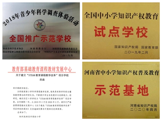 在數(shù)字校園建設(shè)與發(fā)展中,不論是理論經(jīng)驗(yàn)的積累,還是工作實(shí)踐的探索,外國語小學(xué)都獲得了喜人成績。先后榮獲鄭州市研究性學(xué)習(xí)先進(jìn)學(xué)校,河南省中小學(xué)知識(shí)產(chǎn)權(quán)普及教育示范基地、河南省中小學(xué)人工智能教育實(shí)驗(yàn)學(xué)校、青少年科學(xué)調(diào)查體驗(yàn)活動(dòng)全國推廣示范學(xué)校、全國中小學(xué)知識(shí)產(chǎn)權(quán)教育試點(diǎn)學(xué)校,相關(guān)實(shí)踐成果連續(xù)五屆參展中國教育創(chuàng)新成果公益博覽會(huì),被教育部基礎(chǔ)教育課程教材發(fā)展中心確定為“STEAM教育課程教學(xué)改革”項(xiàng)目學(xué)校。學(xué)生參加相關(guān)比賽屢獲佳績,鄭州市中小學(xué)生科學(xué)運(yùn)動(dòng)會(huì)金獎(jiǎng),青少年航空航天模型錦標(biāo)賽鄭州市團(tuán)體第一名和河南省團(tuán)體第二名,河南省青少年電子制作錦標(biāo)賽小學(xué)組團(tuán)體第一名,河南省青少年機(jī)器人競賽團(tuán)隊(duì)銀獎(jiǎng)等。
