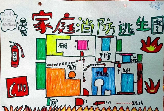 活動(dòng)中,孩子們與家長(zhǎng)一起,根據(jù)家庭的實(shí)際布局情況,共同繪制一份家庭逃生路線圖,圖中標(biāo)明逃生線路及安全出口,可以在火災(zāi)等意外來臨時(shí)節(jié)省寶貴的逃生時(shí)間。一幅幅圖文并茂的手繪作品,準(zhǔn)確標(biāo)注的房屋布局,詳細(xì)的文字介紹,惟妙惟肖的圖片設(shè)計(jì),無不彰顯出孩子們的創(chuàng)意和用心。