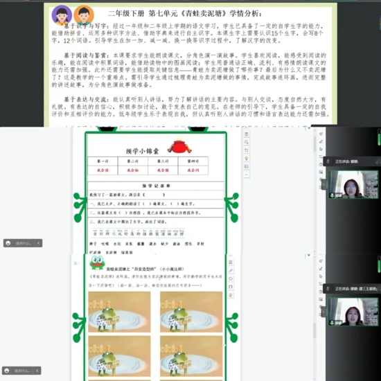 首先,徐小娜老師分享了第一工作坊智慧的結(jié)晶——二年級下冊第七單元第6-9課時(shí)的教學(xué)設(shè)計(jì)。基于單元主題,圍繞“六一”節(jié)目展演的大情境,深耕共研。為達(dá)成教學(xué)目標(biāo),老師們挖苦心思設(shè)計(jì)了適合低年級學(xué)情的教學(xué)活動——內(nèi)容豐富、環(huán)環(huán)相扣,而且創(chuàng)新設(shè)計(jì)了助學(xué)工具——預(yù)學(xué)小錦囊、青蛙過河、泥塘變形記、百變造型師等學(xué)習(xí)手冊,受到老師們的嘖嘖稱贊!