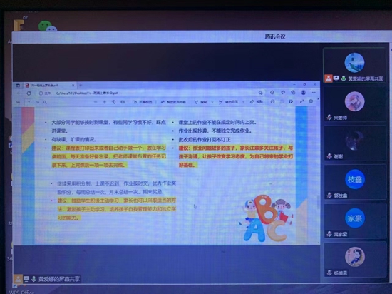 會上,首先各科教師針對近期線上教學中學生學習情況進行總結、反饋,對學生出現(xiàn)的共性問題進行分析,給家長、學生提出具體指導性建議,對表現(xiàn)突出的學生頒發(fā)獎狀,引導大家向榜樣學習。同時對下階段的線上學習的計劃安排對學生提出具體要求。強調家長日常要如何配合老師做好對學生線上學習的督促。