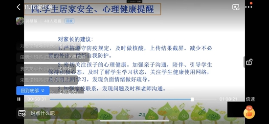 接著,各班主任強調網(wǎng)課期間要重點關注孩子的身心健康,并對各位家長提出了要求和希望并發(fā)出倡議:理性看待孩子的成長,克服焦慮情緒;關注孩子的生命安全及身心健康發(fā)展;利用課余時間,引導孩子多讀書,開展適宜的體育鍛煉和文藝活動,做力所能及的家務勞動等,給孩子一點閑暇的時光,切實減輕孩子學習負擔,落實“雙減”政策。家長會上,學生及家長認真傾聽,對老師們提出的誠懇建議予以認可,紛紛與老師交流,創(chuàng)造溫馨和諧的家庭氛圍。