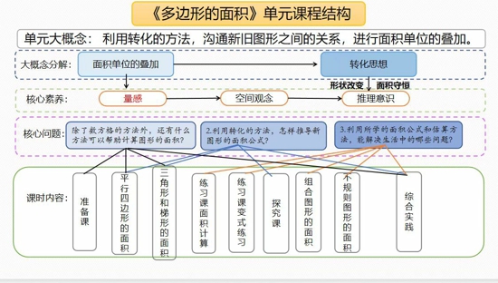 接著,第二組由季艷枝老師進行匯報。對核心素養(yǎng)進行再次整合,保留了推理意識和空間觀念,對量感究竟是否保留提出疑問!最后季老師呈現(xiàn)了清晰明了的單元課程結(jié)構(gòu)圖為后續(xù)的單元整體教學(xué)研究提供了明晰的思路。