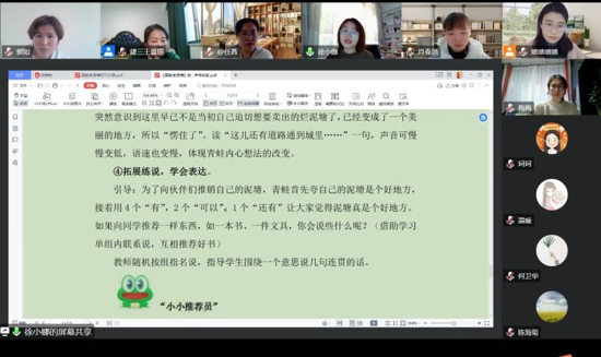 徐小娜老師以《青蛙賣泥塘》為例,緊扣主題,依托單元大情境——六一節(jié)目展演,不僅設(shè)計了有趣的活動,如小青蛙過河——生字檢測、小青蛙賞花——詞語檢測……,而且聚焦問題串——誰賣?賣給誰?為什么買?賣出去了嗎?為什么……精心設(shè)計了學(xué)生手冊及評價量表,為演好故事打下堅實(shí)的基礎(chǔ)。趙新婷和肖春艷老師則以《小毛蟲》為例分享第八九課時教學(xué)設(shè)計。趙老師基于學(xué)情的深入分析,采用“對比”的方法,課始以昆蟲生機(jī)勃勃和小毛蟲慵懶的圖片感知小毛蟲的特點(diǎn),然后引領(lǐng)學(xué)生初讀課文,走進(jìn)小毛蟲……......激發(fā)學(xué)生閱讀興趣。肖老師作為接力賽的第三棒,設(shè)置有趣的活動,有效引導(dǎo)學(xué)生自主學(xué)習(xí),借助關(guān)鍵信息完整講述故事,整個教學(xué)設(shè)計環(huán)環(huán)相扣,層層遞進(jìn)。
